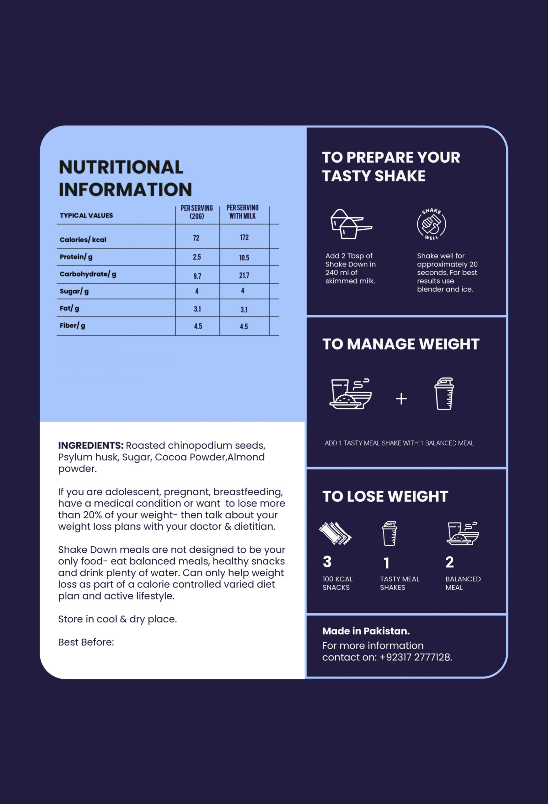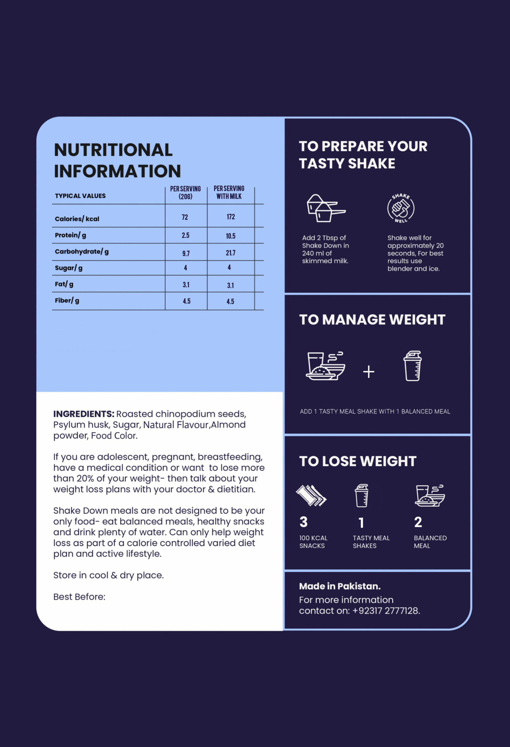 For a more balanced meal, ShakeDown should be consumed with milk or alongside a protein source.